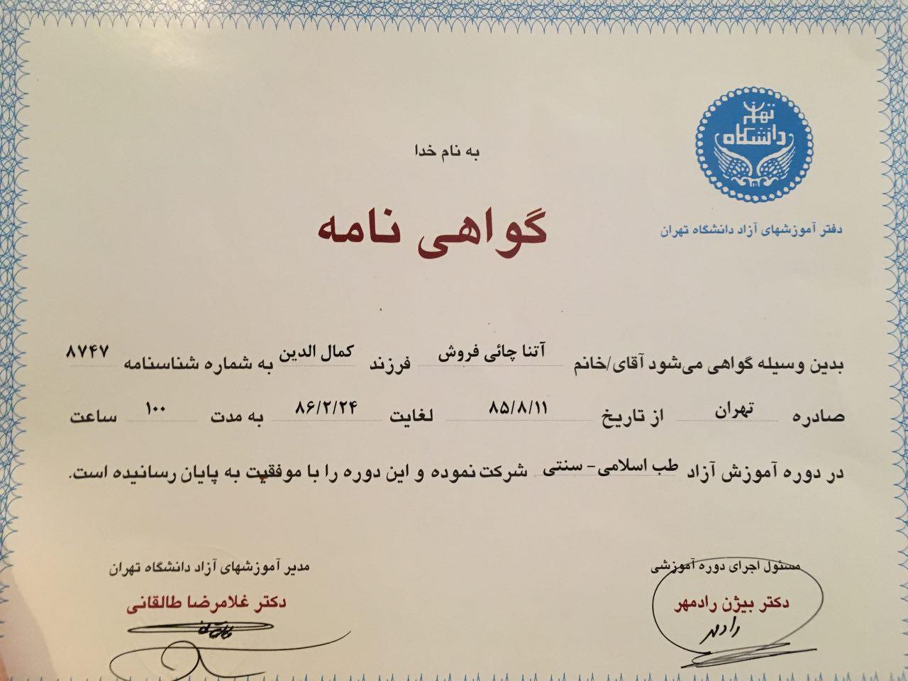 اتنا چائي فروش جدا از بهره مندي از آموزشهاي مادر و كمك در داروسازي در لابراتور و مطالعات شخصي بسيار در زمينه طب سنتي و طب هندي و چيني ،به دليل علاقه مندي از كودكي ،دوره هاي اكادميك زيادي را در اين زمينه گذرانده و مدارك زير را دريافت نموده